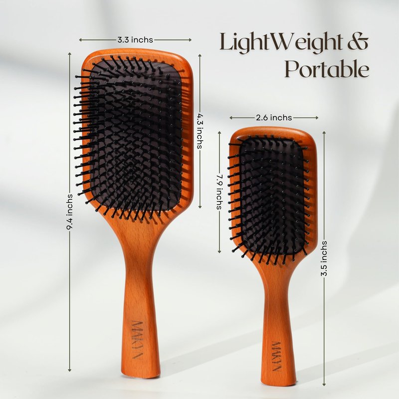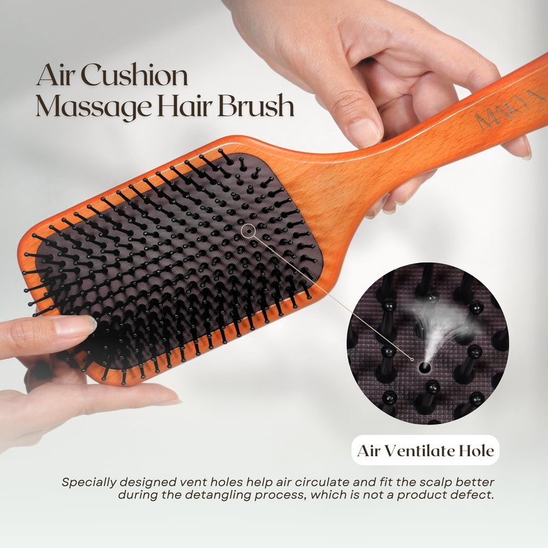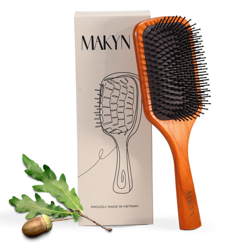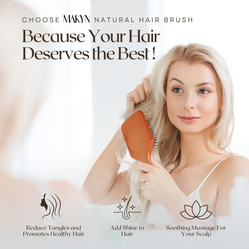 - [Paddle Brush for Massaging Scalp & Detangling] Featuring a ergonomic wood handle, MAKYN paddle brush ensures a comfortable grip for styling. The rubber massage cushion not only stimulates the scalp, promoting optimal hair growth, but also healthier scalp. The wooden pins contribute to the distribution of natural scalp oils, effectively preventing frizz and facilitating seamless styling. Suitable for both women and men, coarse, fine, thick, or thin hair and straight or even very curly hair.