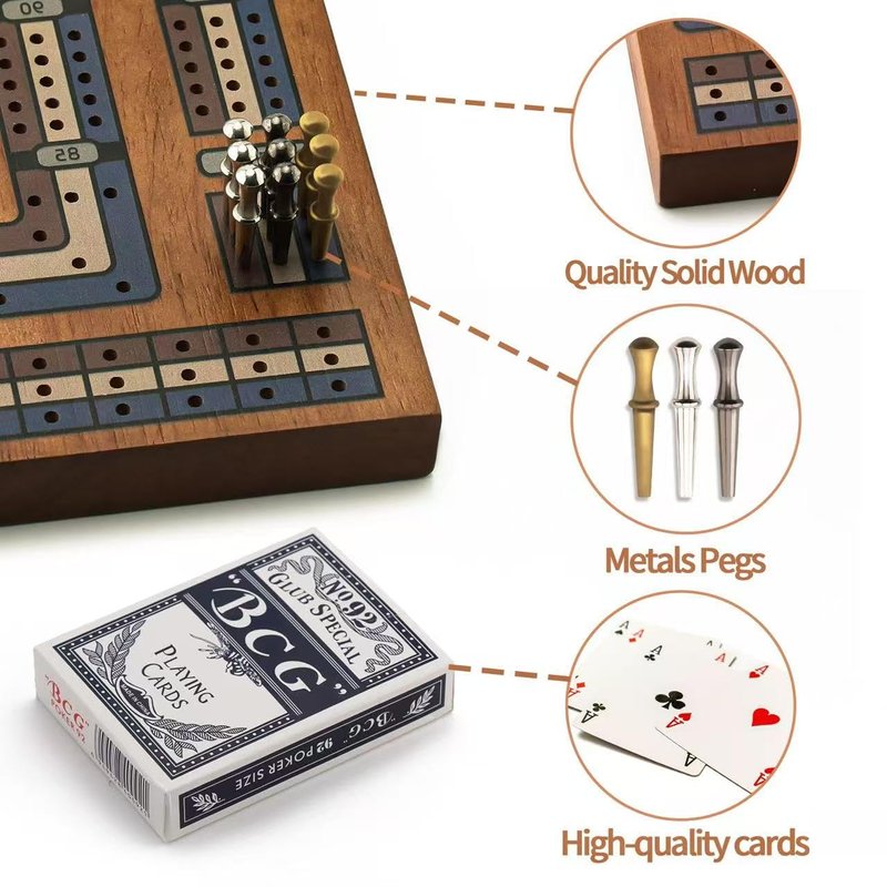 - Deluxe board game Set:The Cribbage Board is made of high quality solid wood and comes with 3 sets of 3-color metal pegs (gold, silver, and black) for a total of 9, which are more durable and have a better texture than plastic pegs and 1 full deck of playing cards, making it ideal for tabletop games on family game night.