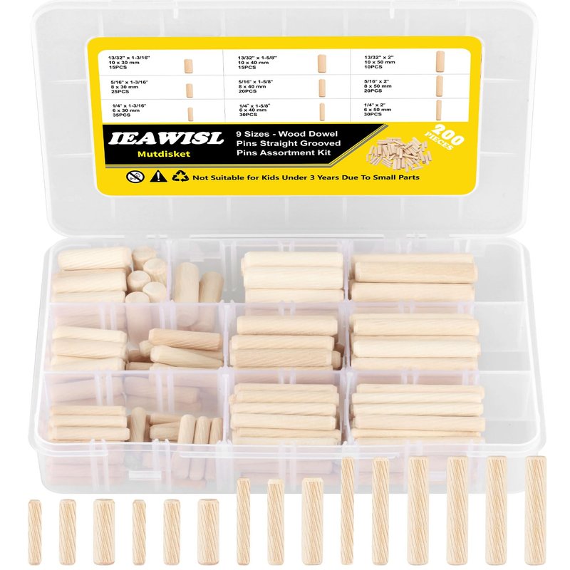 - 【COMPLETE RANGE OF WOOD PINS SIZES】: IEAWISL 200pcs wooden dowel pins integrate the 9 most commonly used imperial size kits on the market: ①6x30mm(6/25"x1-3/16"), ②6x40mm(6/25"x1-5/8"), ③6x50mm(6/25"x2"), ④8x30mm(5/16"x1-3/16"), ⑤8x40mm(5/16"x1-5/8"), ⑥8x50mm(5/16"x2"), ⑦10x30mm(3/8"x1-3/16"), ⑧10x40mm(3/8"x1-5/8"), ⑨10x50mm(3/8"x2"). These different sizes make up a complete set of wood pins to meet your woodworking project needs.