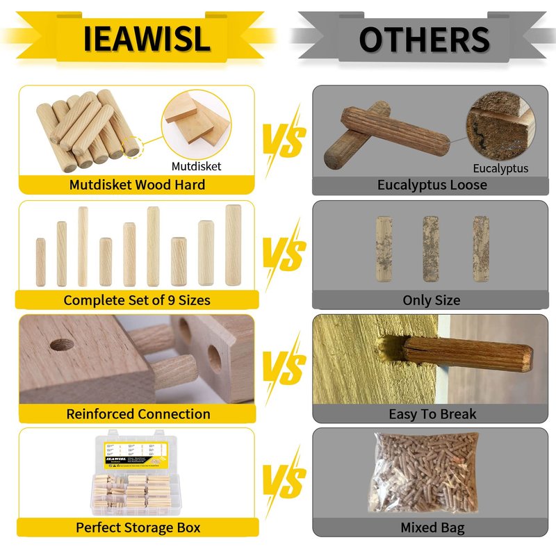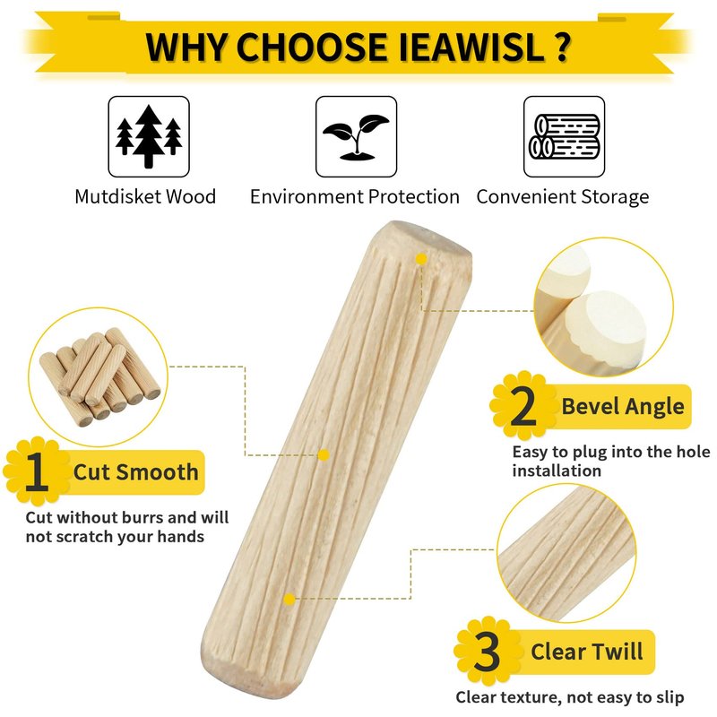 - 【HIGH QUALITY MUTDISKET WOOD MATERIAL】: IEAWISL wooden dowel pins are made of 100% natural Mutdisket wood material with smooth surface and high hardness, which has strong and durable characteristics. In contrast to the eucalyptus wood material in the market which is easy to be soft and cracked with poor quality, our upgraded Mutdisket wood pins are more dense and will not break or bend. Also, the wooden pins are designed in cylindrical shape with chamfered ends for easy insertion.