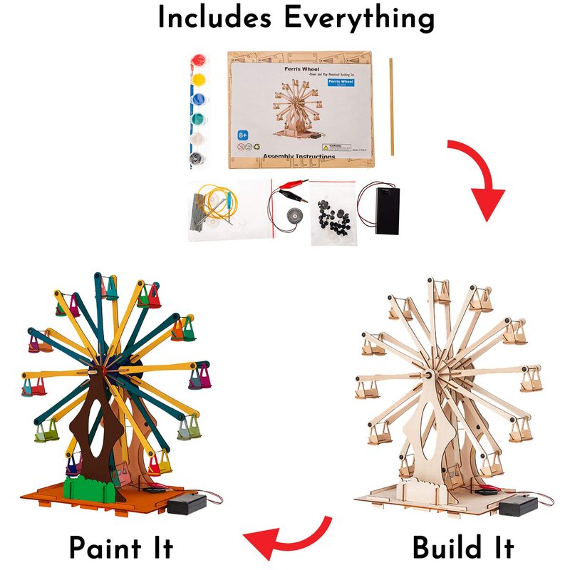 - Includes 6 vibrant, non-toxic paints to customize the ferris wheel model