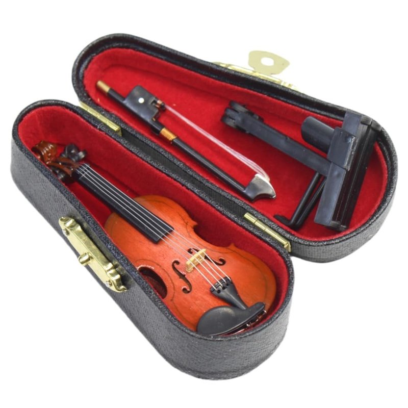 Wooden Miniature Violin with Stand, Bow and Case, Mini Musical Instrument, Dollhouse Model Miniature Home Decoration (3.15")