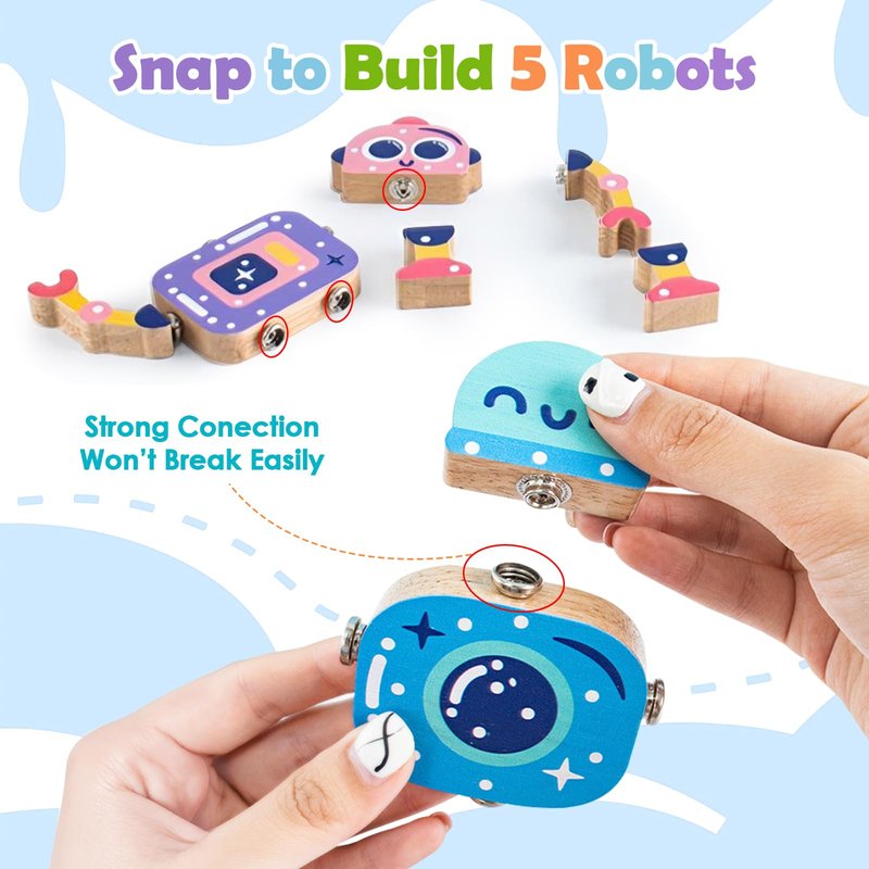 - 【Build Five Robotic Creatures】You will receive 28 pcs of wooden open-ended robot builders.Kids can use these color-coded snap-together heads, legs, arms and to Body create many kinds of robots, also kids have the incredible opportunity to harness their vivid imaginations and blend these versatile builders together, crafting a myriad of awe-inspiring shapes!
