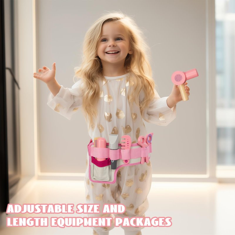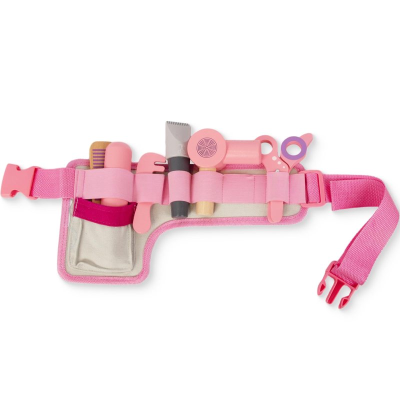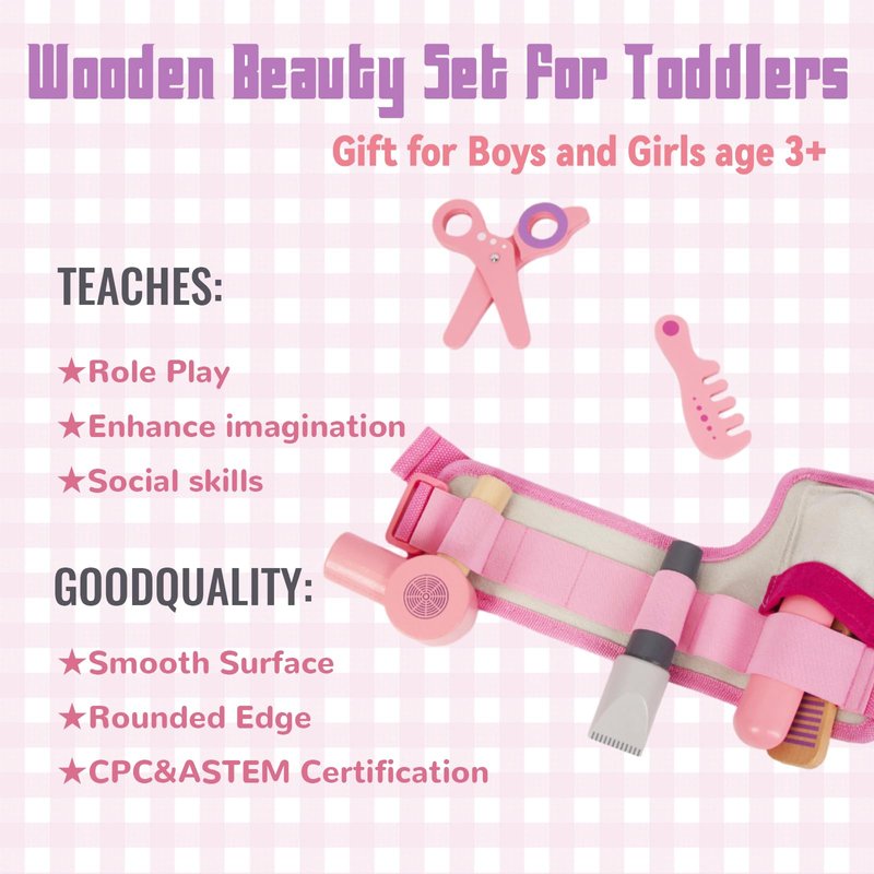 WoodenEdu Wooden Hair Salon Toys for Girls, Pretend Play Beauty Salon Set with Realistic Accessories, Blow Dryer, Straightener, Tool Belt and Styling Accessories