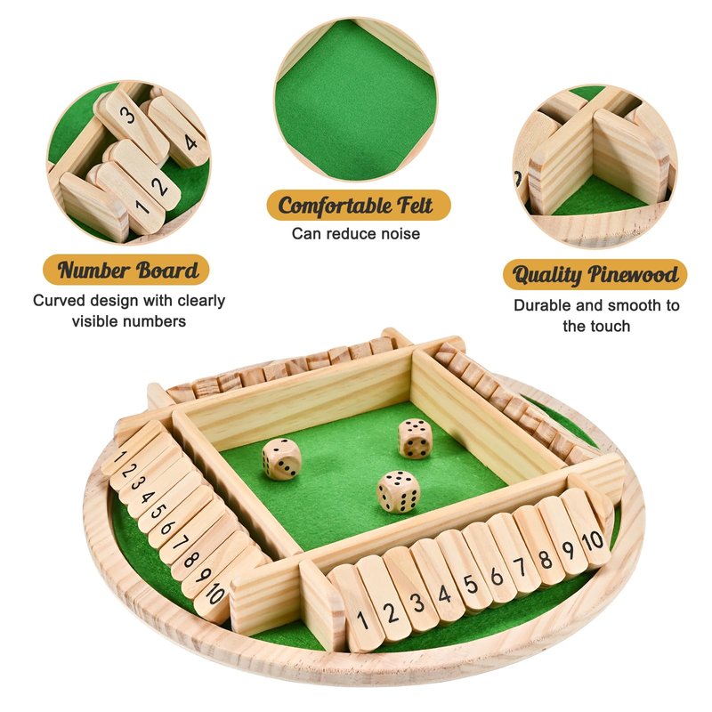 - Classic Board Game: Our shut the box dice game features a unique round shape, made of high quality pine wood with a soft green felt surface, comes with a 4-sided board with 10 numbered boards each, 4 colours, and 1 instruction sheet, durable, scratch-resistant, and eco-friendly. Size: 10.2 x 10.2 x 1.57 inches