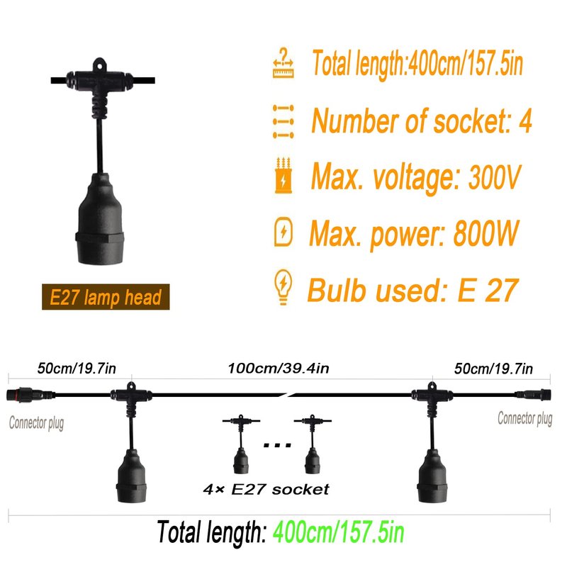 - 【Specifications】: 2 Pole Outdoor LED Light String 4m LED Cable Connector Wire, IP68 16AWG Waterproof Cable. With LED Plug and Socket at both ends. With 4 E27 Lampholders.