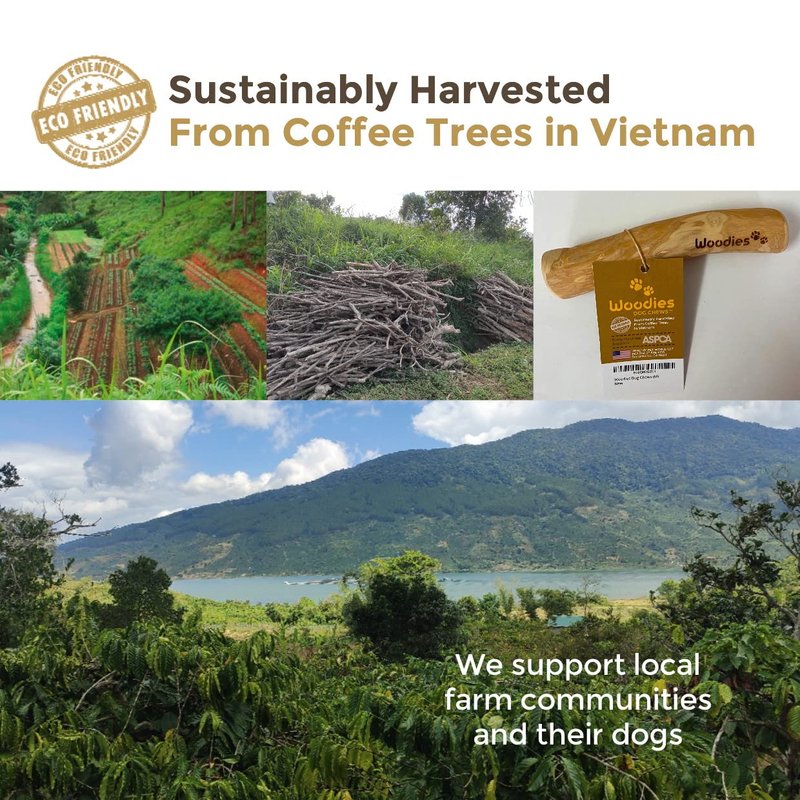 - US COMPANY: Woodies is a US small business. We designed the product in California and invested in a family-owned coffee farm in Vietnam to produce our dog chew toys.