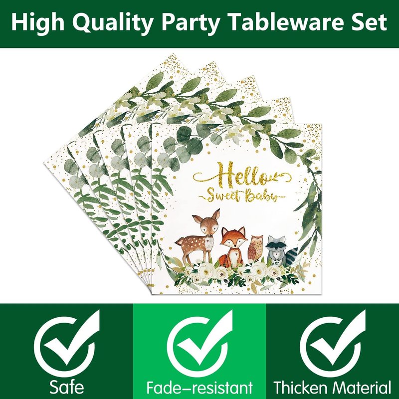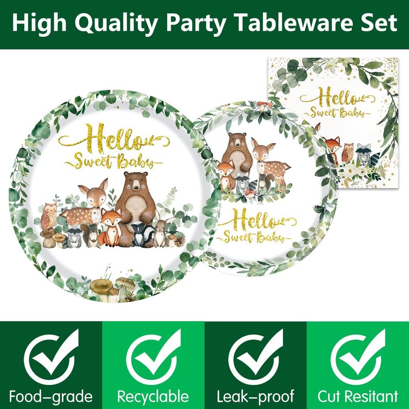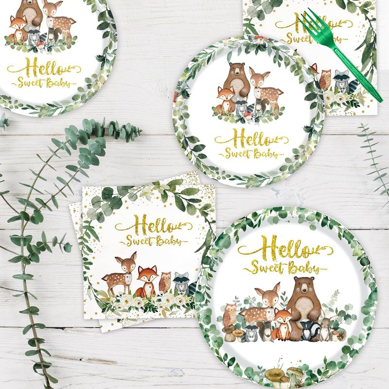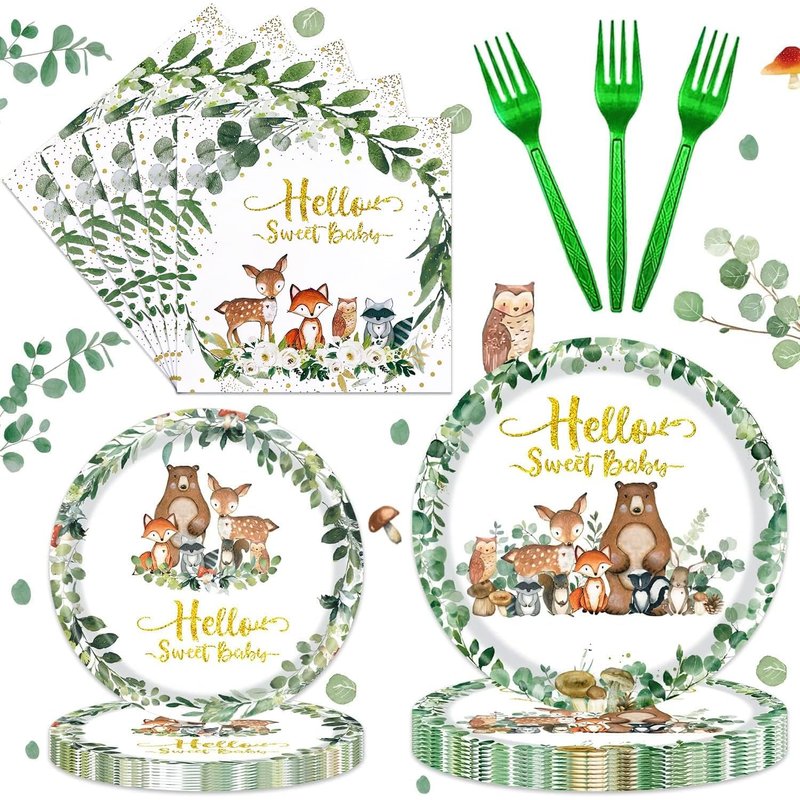 - 【Package Includes】: Our woodland baby shower decorations comprise 24 each of 9'' dinner plates, 7'' dessert plates, napkins, and forks, creating a complete set of woodland party supplies.