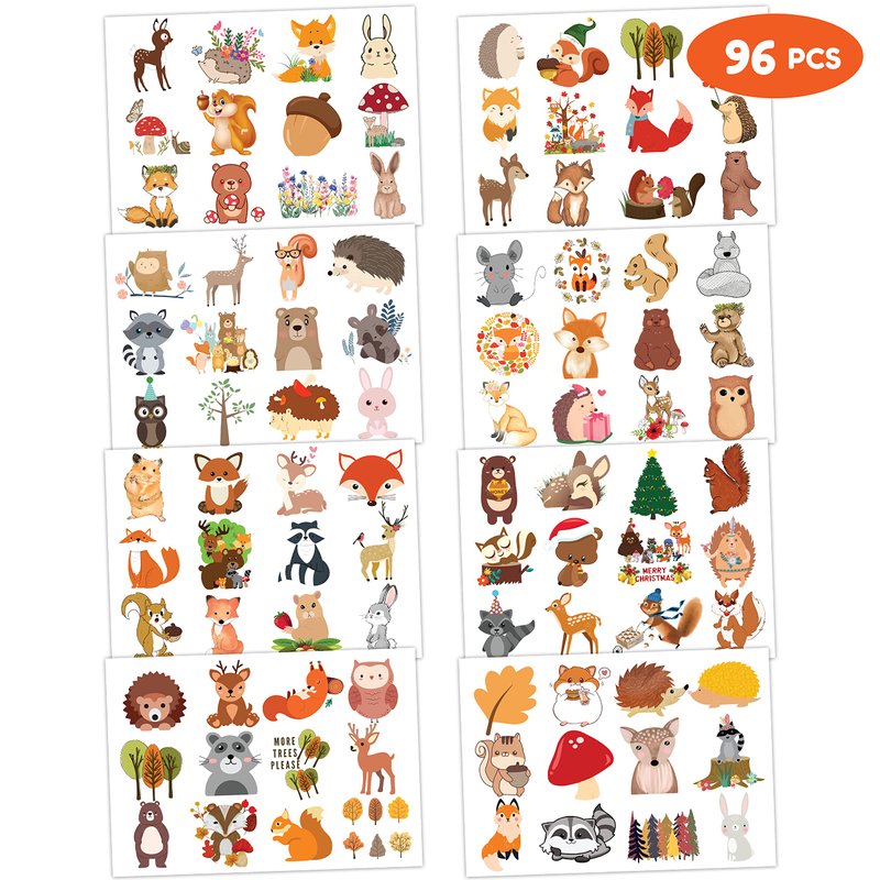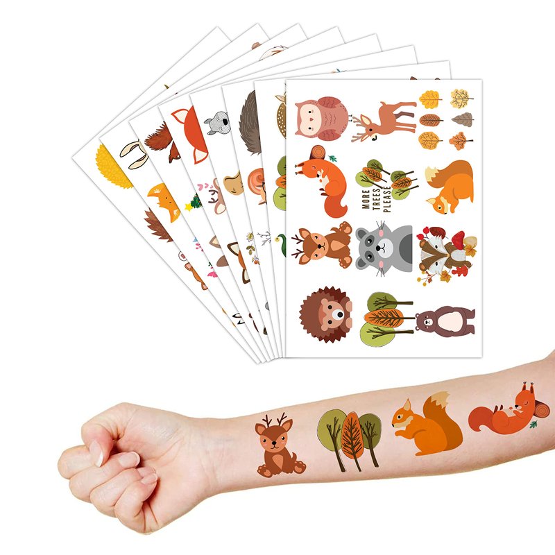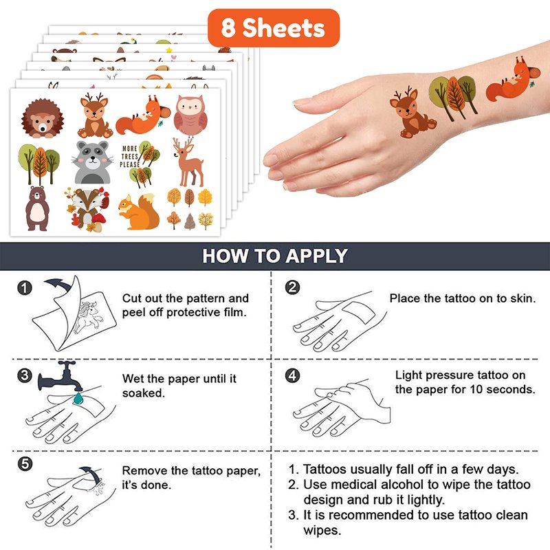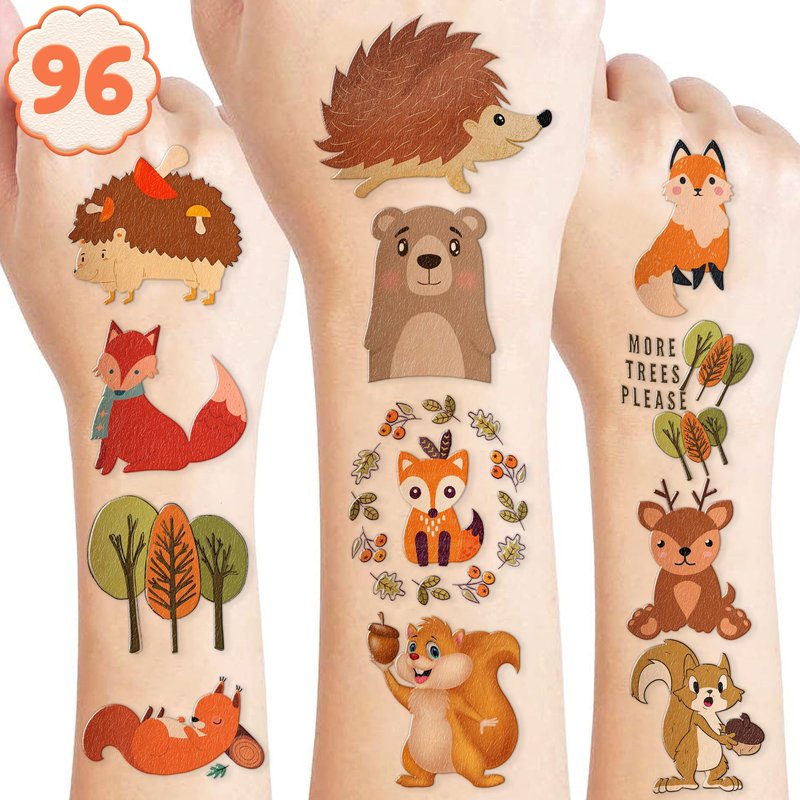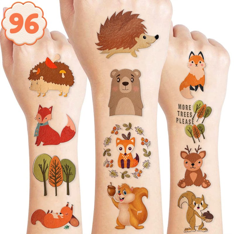 - 🍁【PERFECT TATTOOS FOR THEMED WOODLAND DECORATIONS】: Woodland temporary tattoo stickers include 8 sheets in total. There are 96Pcs super cute tattoo differences. Perfect for giving out party favors and holiday theme small gifts. The size of each sheet is 6.1 * 3.1 inches. One size fits kids.