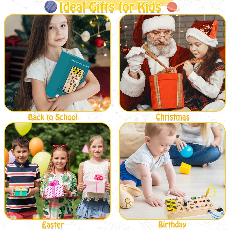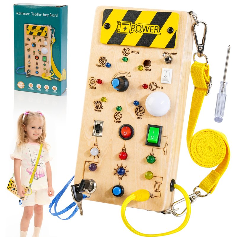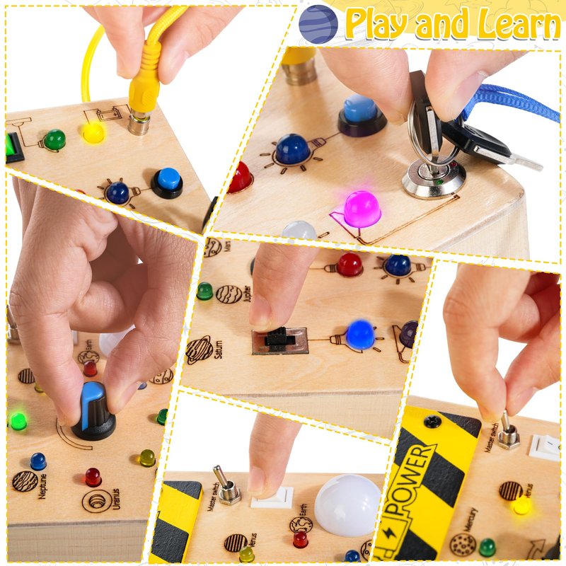 - Montessori Busy Board with LED Light: This busy board is designed for little who loves buttons, lights and figuring things out. 9 switches set up on the board including 1 master switch as well as 8 light switches corresponding to 15 LED light bulbs. Needs 2 AAA batteries (not included), please prepare by yourself before use