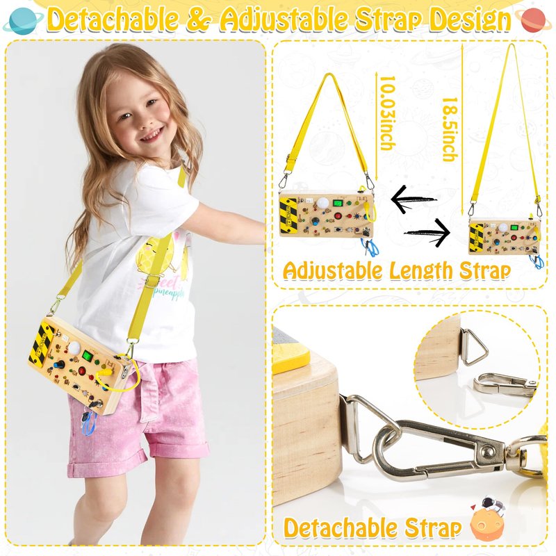 - Detachable & Adjustable Strap Design: Unlike other busy board, ours comes with a detachable and length adjustable shoulder strap, so young ones can more easily carry the Montessori busy board with ease. It's a compact size so ideal for travel, great to keep little ones busy on road or plane trips