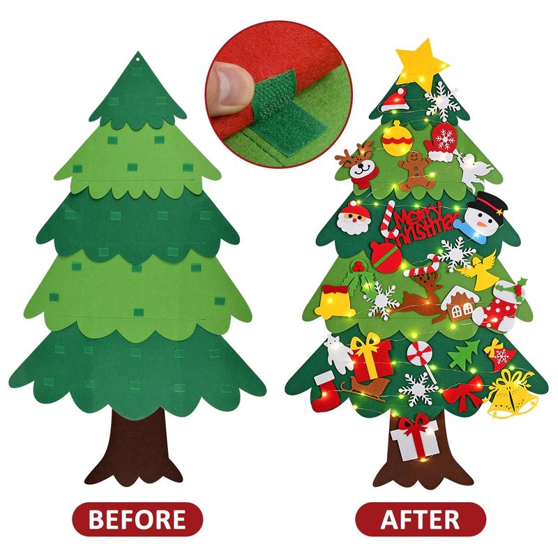 - ๐๐๐DIY Felt Christmas Tree : 3.5ft large size felt Christmas tree. The thickness of felt tree is 4mm. One Felt Christmas Tree With 33 Pcs detachable Christmas ornaments (santa claus, snowman, snowflake, Christmas socks, etc.), 1pcs 9.8ft string light that can be wrapped around your tree.(Batteries not included)