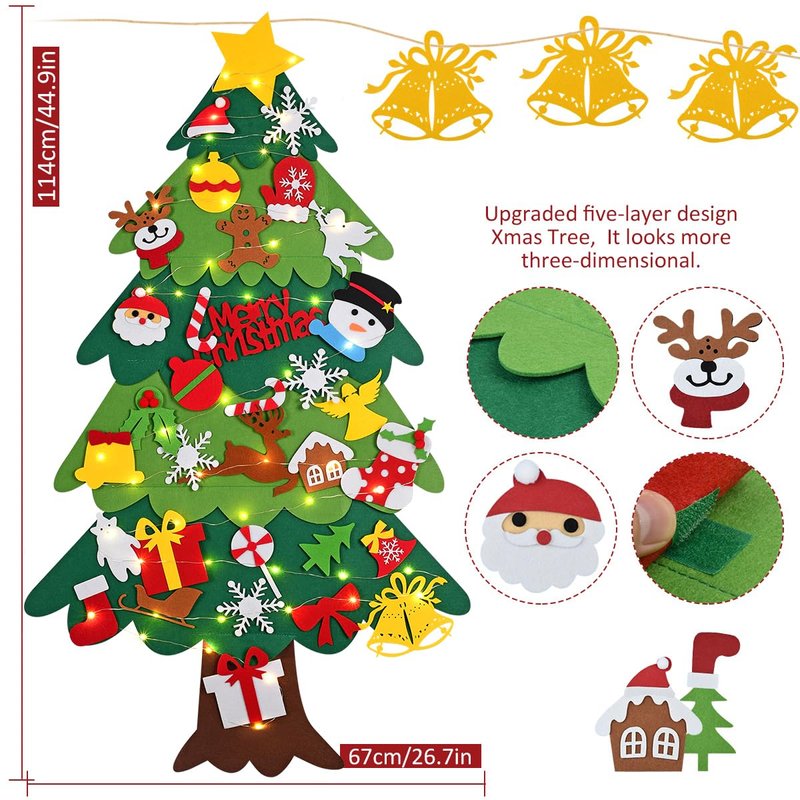 - ๐๐๐Upgraded Family Xmas Tree: Different from ordinary graphic design, this new upgraded felt christmas tree with new five-layer design. It looks more three-dimensional. You'll also get a string light to light up your christmas tree, Let your home full of christmas atmosphere. Made especially for families and children!