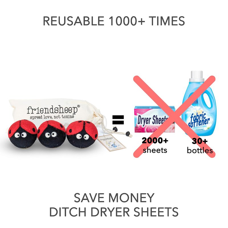Wool Dryer Balls by Friendsheep 3 Pack XL Organic Premium Reusable Cruelty Free Handmade Fair Trade No Lint Fabric Softener Ladybug Trio