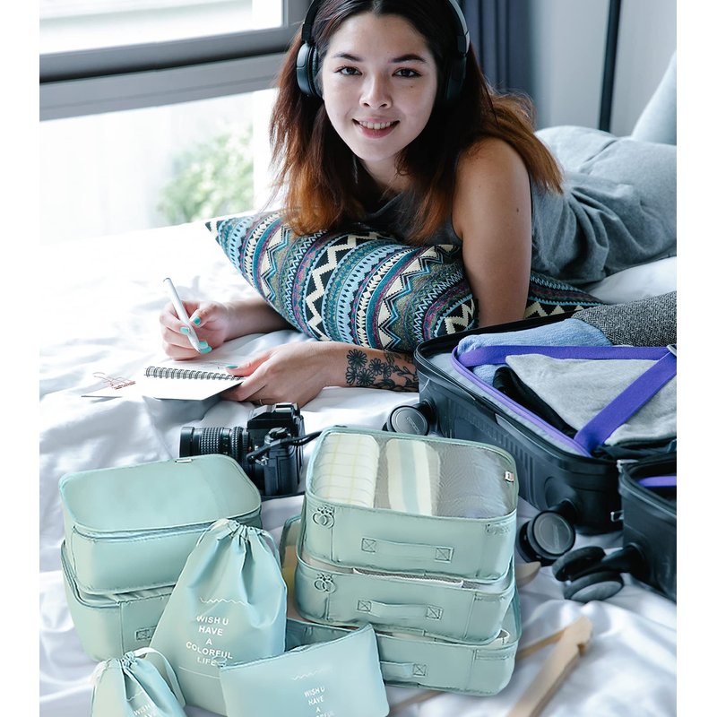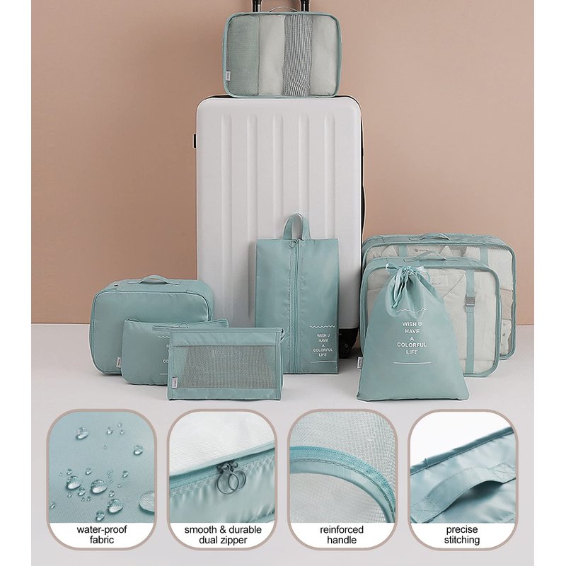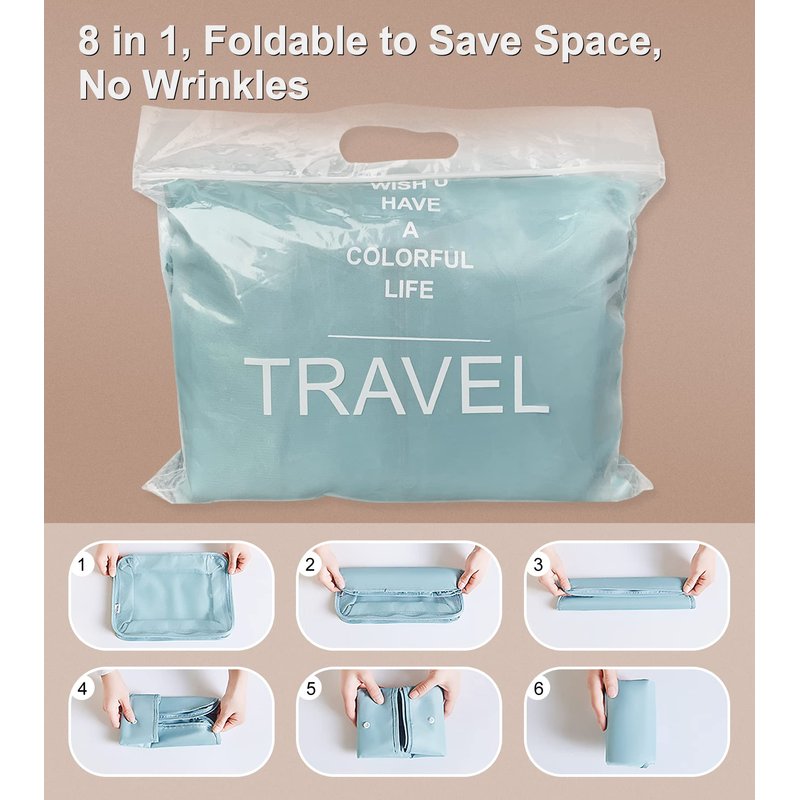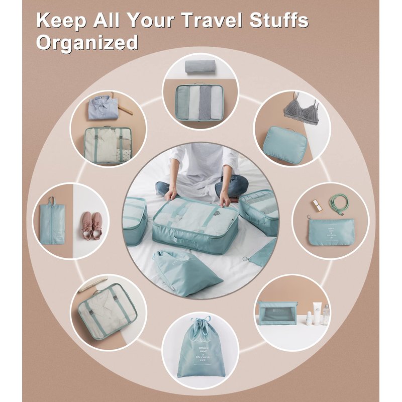 - 👚Multiple Sizes 8 in 1: 3 different sizes of clothes bags, 1 underwear bag, 1 dirty clothes bag, 1 shoe bag, 1 makeup bag or electric accessories bag and 1 toiletry bag, These different sizes and types packaging cubes can perfectly organize your luggage, which meets your packing need for a short or long trip. They can maximize your luggage space, not only allow you to put more things in your luggage, but also keep your clothes organized and improve the space utilization of your suitcase.