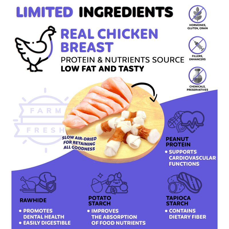 In our collection, we present 4 distinct treats, each gently made to please your dog's well-being. These offerings upgrade the ordinary, providing a symphony of taste and wellness for your cherished companion. These treats serve as guardians of your pet's health. The unique textures are designed to reduce tartar buildup, freshen breath, and promote overall dental health. Each chew becomes an act of care, effortlessly training gums and removing tartar, leaving behind a gleaming puppy smile. What sets our treats apart is their natural composition. Crafted from natural chicken breast and corn starch, they embody the quality. This commitment to quality ingredients ensures that your pet receives not just a tasty treat, but a wholesome snack that aligns with their dietary needs. These treats are about promoting a healthier lifestyle. Low in calories and low in fat, they serve as a guilt-free satisfaction, allowing you to maintain a balanced diet for your furry friend. The dietary features of these treats make them an excellent choice, contributing to your pet's overall well-being. The taste journey begins with the irresistible flavor of chicken. Each strip, stick, or bone contains the essence of chicken, promising a taste experience that captivates your dog's senses. The chewy texture adds a layer of enjoyment, turning every snack time into a captivating moment for your canine furry friend. Designed with versatility in mind, our treats suit all dog breeds and sizes. Whether you have a petite pup or a larger canine companion, the treats are crafted to cater to the diverse needs of dogs, ensuring that every tail wags with delight.