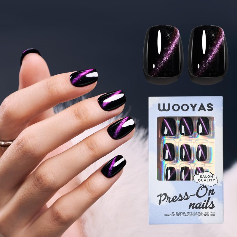 Wooyas Cat Eye Press on Nails Short, 9D Glitter Black Square Handmade Fake Nails with Purple Glitter Design, Glossy Salon Perfect Magnetic Gel Nails in 12 Sizes - 24 Pcs Nails Kit for Woman