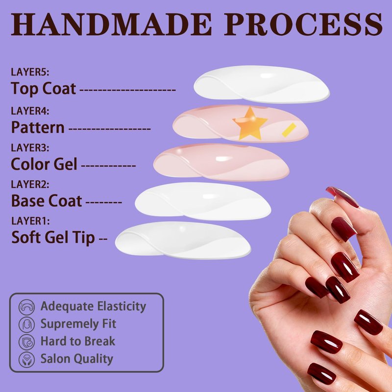 - 💥Salon Effects: Each red press on nail is hand-painted by the manicurist (premium base coat, color gel, pattern, top coat). "Jelly" high gloss effect, looks like salon quality, no wrinkle, wear resistant, unbreakable and easy to apply!