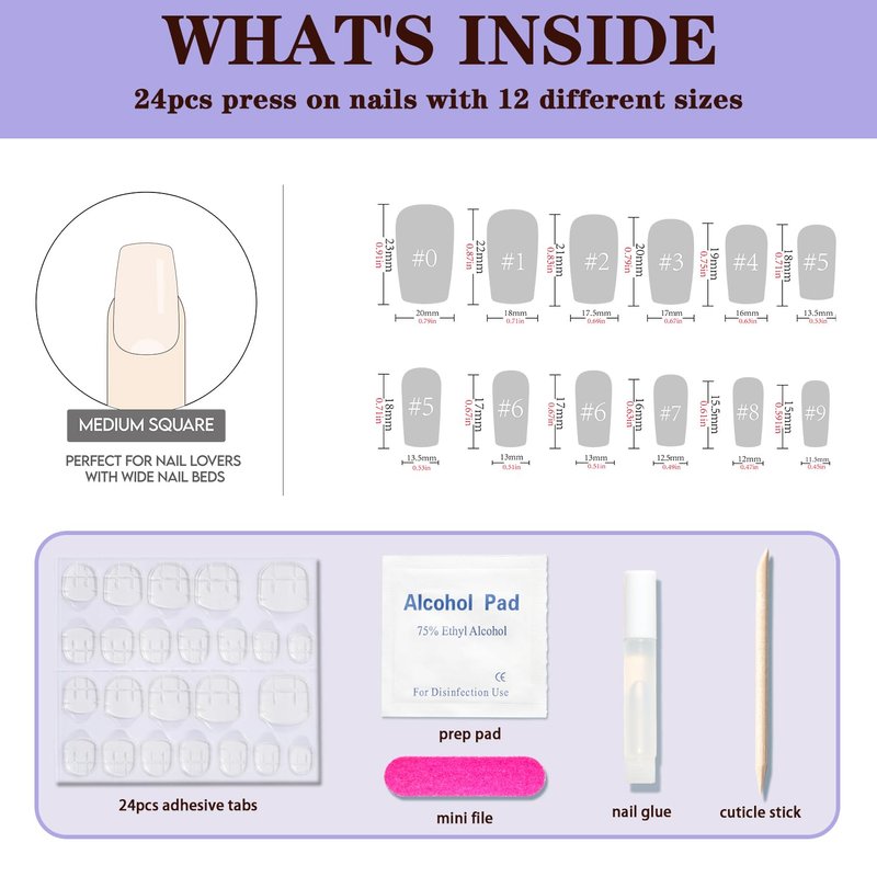 - 💥Packing List: Press on nails kit comes with 24pcs fake nails in 12 different sizes for each finger. Each false nail set comes with nail glue, 24 pieces of adhesive tabs, preparation pads, mini file, cuticle stick. French can be DIY trimmed to any length you like, great gift for women and girls!