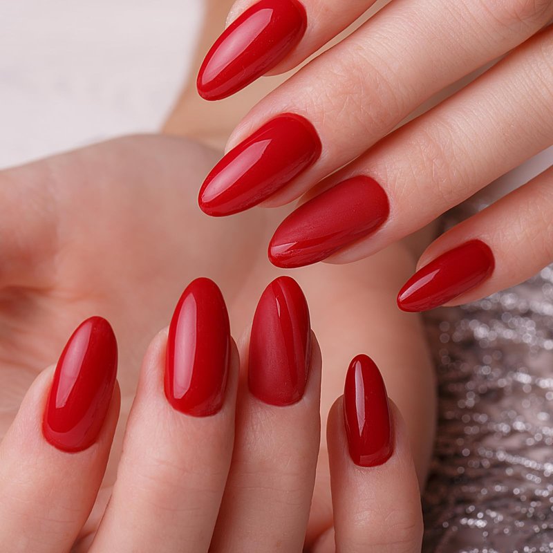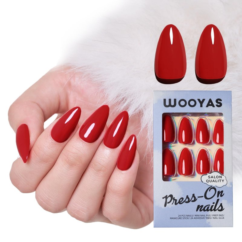 Wooyas Press on Nails Almond,Classic Red Medium Glossy Handmade Gel False Nails,Reusable Salon Perfect Fake Nail Kit in 12 Sizes - 24 Pcs Soft Gel Glue On Nails Kit for Women Gift
