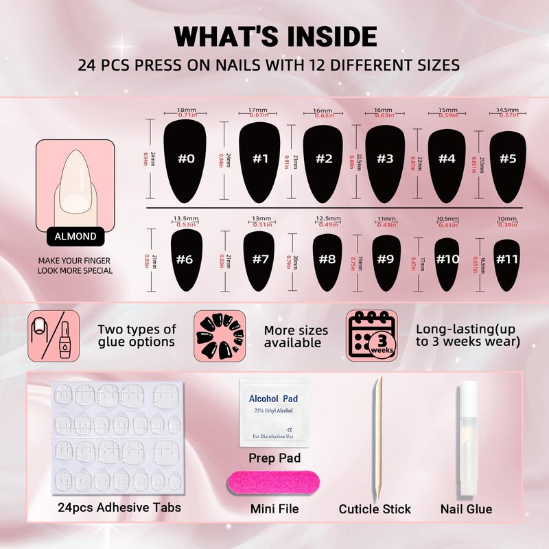 - 💥Packing List: short fake nails almond comes with 24pcs fake nails in 12 different sizes . Each set comes with nail glue, 24 pieces of adhesive tabs, preparation pads, mini file, cuticle stick. French can be DIY trimmed to any length you like, great gift for women and girls!
