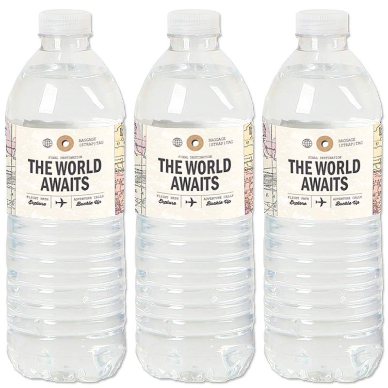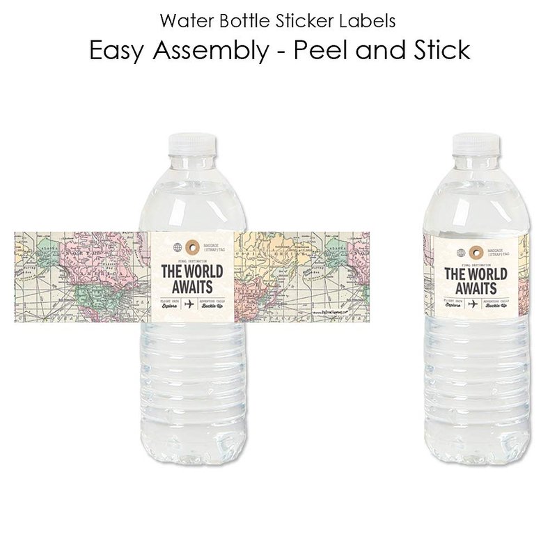 - MADE IN THE USA: World Awaits - Travel Themed Party Water Bottle Sticker Labels are designed and manufactured at our Wisconsin facility using materials that are Made in the USA. Please Note: Beverages in image are not included.