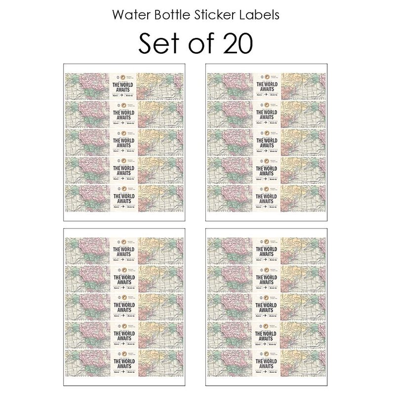- UNIQUE BEVERAGE BAR: World Awaits Water Bottle Labels will make coordinated beverage area at your bridal shower, graduation or birthday party. Add Travel Themed Water Bottle Labels to standard water bottles, mini water bottles, soda bottles and single-serving juice containers. Water bottle labels can also be used on cylinder containers to create vintage travel centerpieces.