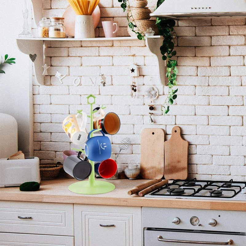 World Backyard Plastic 6 Mugs Holder Tree Cups Hanging Stand Green with Bird & House Sign, Coffee Tea Cup Rack Counter Bar Accessory