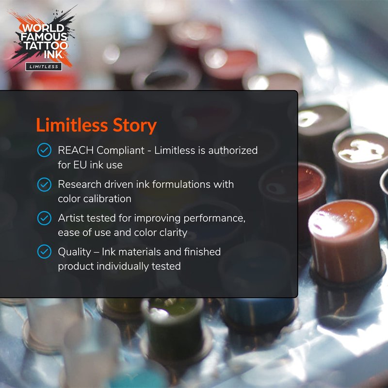 - REACH COMPLIANT INKS – Our LIMITLESS is a new REACH-compliant line for artists in Europe. The permanent tattoo ink is ultra-safe and pure. All World Famous Tattoo Inks are purified and safety sealed.