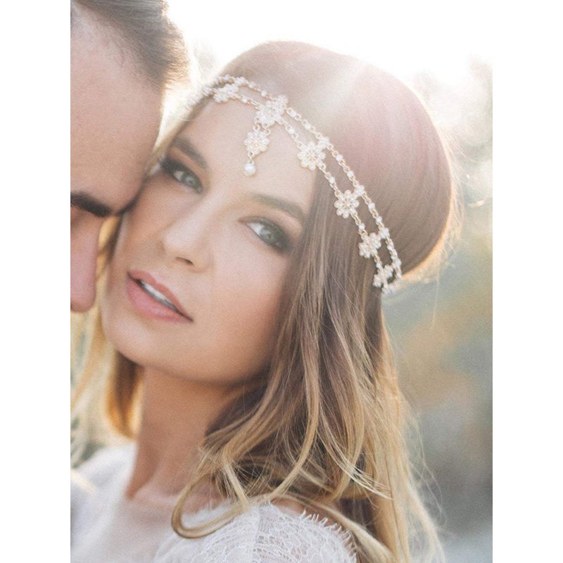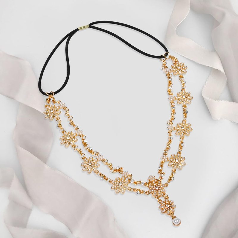 - Available in 2 stunning colors: Gold head jewelry for women and silver head pieces for woman. Our boho hair jewelry features a two-layer design. The first tier is made up of nine 2.7-inch sized pearl-studded flowers strung together. The second layer is a string of nine 6.29-inch sized flowers with countless pearls and rhinestones. Expertly crafted for a delicate and glamorous look.