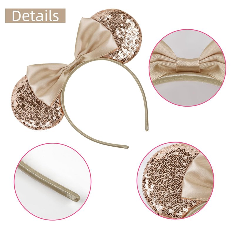 - Mouse ear headbands made of velvety polyester fabric covered with glitter sequins, sturdy, durable, non slip, stay on your head well.