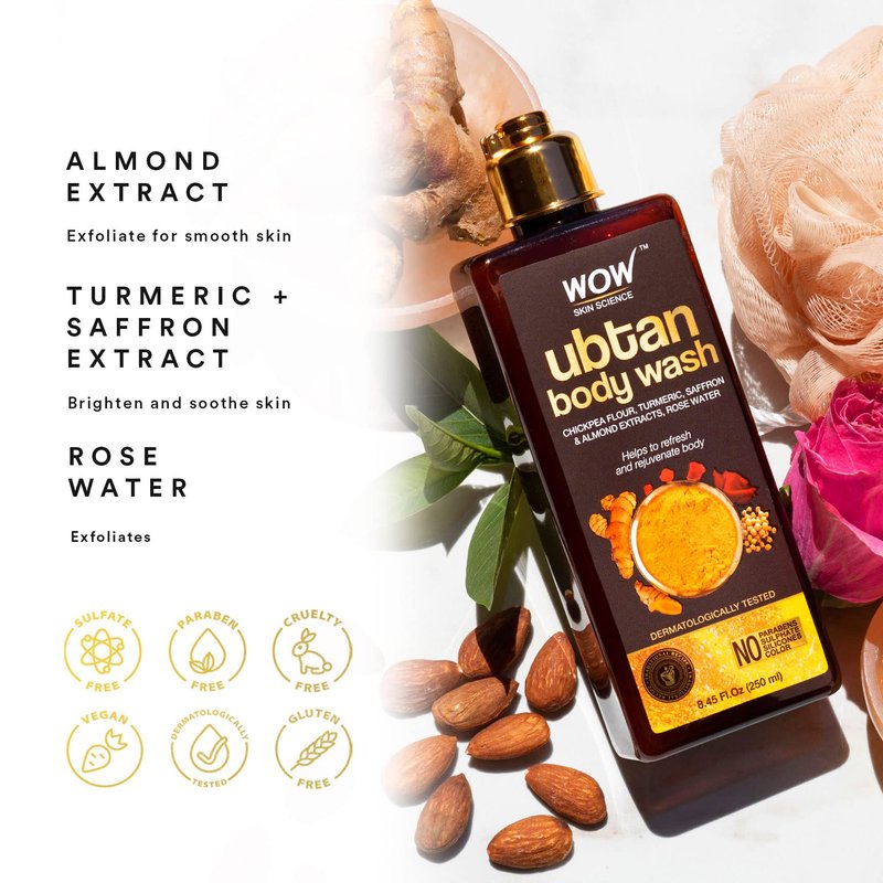 - Beneficial Ingredients: Our WOW Skin Science hydrating shower gel body wash is 100% vegan and has ingredients like almond, turmeric, saffron extracts, sandalwood oil, rose water and chickpea flour to remove impurities and make your skin smooth.