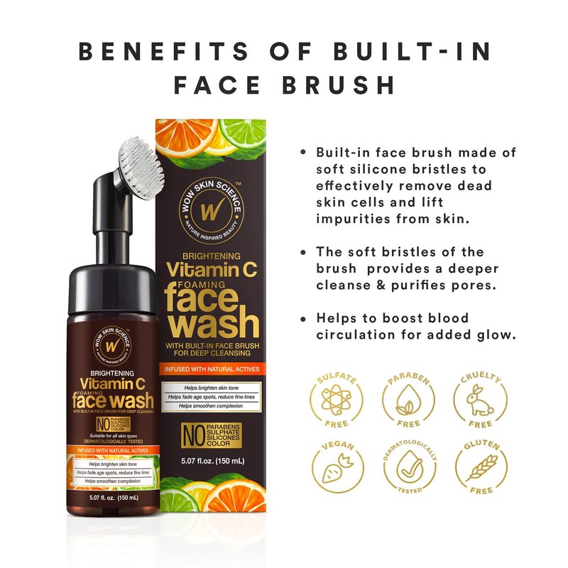 WOW Skin Science Vitamin C Face Wash w/Face Brush - Foaming Facial Cleanser - Facial Skin Care Products - Acne Face Wash for Women - Exfoliating Face Wash Men's Scrub - All Skin Types (150ml)