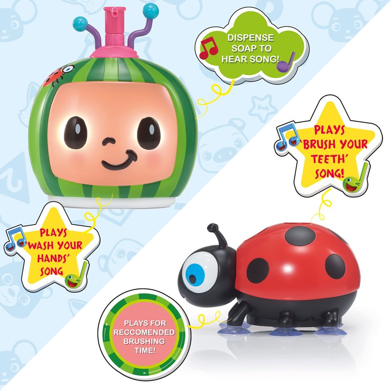 - MULTIPLE FEATURES - The comforting CoComelon face lights up on the soap dispenser when the music plays! Toothbrush holder opens up for easy cleaning and holds your child's toothbrush safe and ready for next time. Music can be turned off at anytime