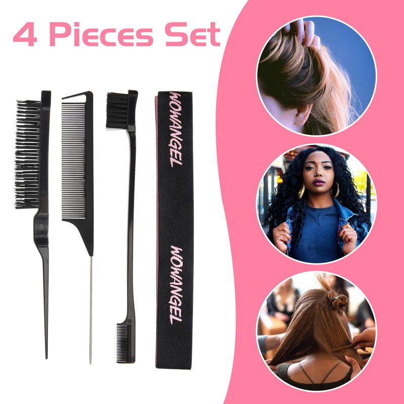 WOWANGEL 4Pieces Hair Styling Brush Set - Teasing Hair Brush, Rat Tail Comb, Dual Edge Brush, Elastic Band for Edge&Back Brushing, Combing, and Slicking - Women Girls Stylists Baby Beauty Accessories (Black)