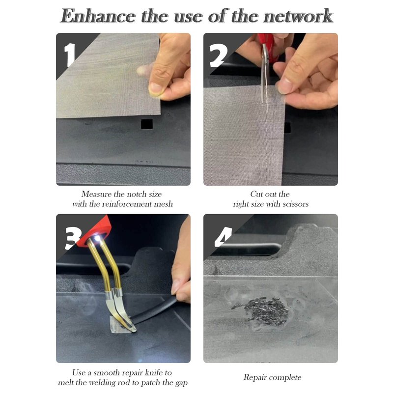 - Easy to use - just heat the underlying plastic enough so that the cut piece of mesh is held temporarily in place before applying more heat to melt it through. Then take the plastic rods to melt on top of the mesh to fully cover the section.