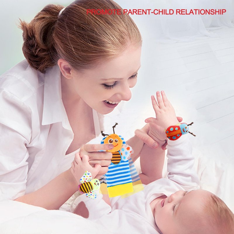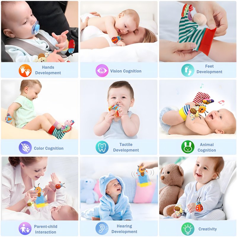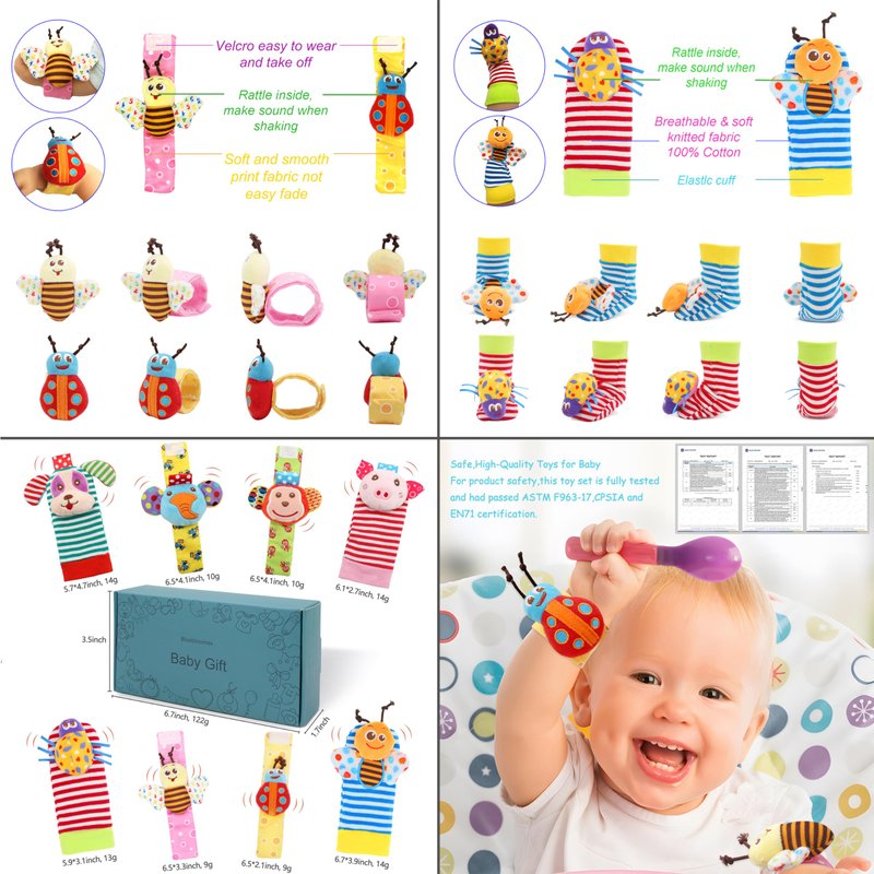 Why choosing our rattle set?♫ Babies like to watch and play the fingers, it’s fun for the baby to play if he/she wearing a Rattle on hand.♫ There’s a rattle inside, softly-sound and attract their attention.♫ Rattle socks can keep baby's feet warm and bring more fun to baby's feet movement!Description:Material: Plush+cotton+VelvetPatterns: 4 animals-Monkey、Elephant、Pig and Dog, 4 bugs-Bee、Butterfly、Dragonfly and LadybugSize: Wrists-5.9*1.06 inch /Socks-5.5*2.36 inchSuitable for: newborn, infants,baby boy /girlPackage included: 4 * Baby Wrist Rattle + 4 * Foot Rattles Finder SocksSafe, High-Quality Toys for BabyFor product safety, this toy set is fully tested and had passed ASTM F963-17 & CPSIA certification.Wearable,Adjustable & WashableWrists rattles were with Velcro,the length on body can adjusted,easy to wear and take off.The rattle toys can wear on hands and foot,baby will not lose them or throw them on the ground.The socks and wrist rattles can be washed (recommended hand washing).Perfect Gifts!Gifts for Baby showers/Baby sprinkle/Sip & See gift/Newborn baby gift/Registry gift/Easter/Halloween/Thanksgiving/Christmas/Holiday gift/Christening gift/'Just because' gift.100% MONEY BACK GUARANTEE If you are not 100% satisfied with our Baby rattle toys, we offer a 30-days money back guarantee.