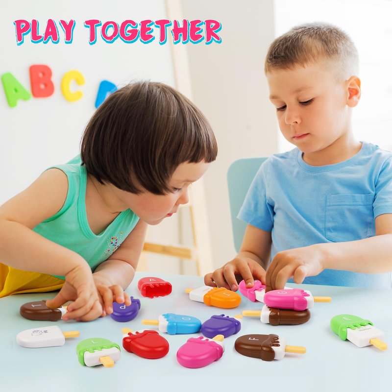 - 【Durable Educational Toy】 The high-quality ice-lolly alphabet set is an ideal manipulation game for improving fine-motor skills in classrooms, homeschooling aid, and daycare tool. Kid-friendly size and smooth surface makes it perfect for small hands to grip and put each part together with ease. Various eye-catching colors help develop color identification skills and help keep a child’s attention