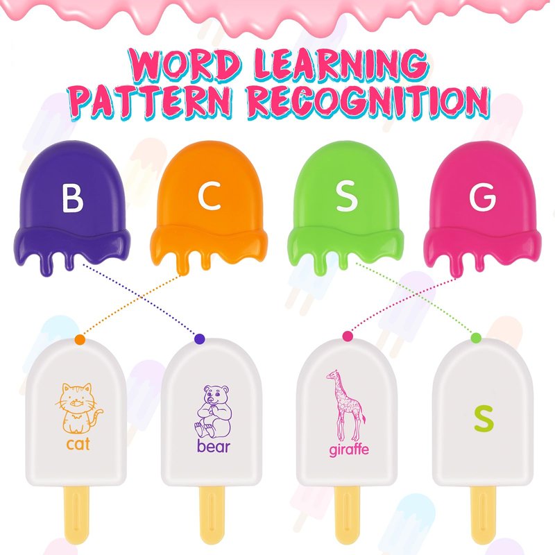- 【Alphabet Matching Set】: This matching toys set includes a value pack with double sided ABC and words ice-lolly, 1 drawstring bag and 1 storage box. Cute Ice-lolly shapes are loved by children, let them have a strong interest in finding and matching letters.