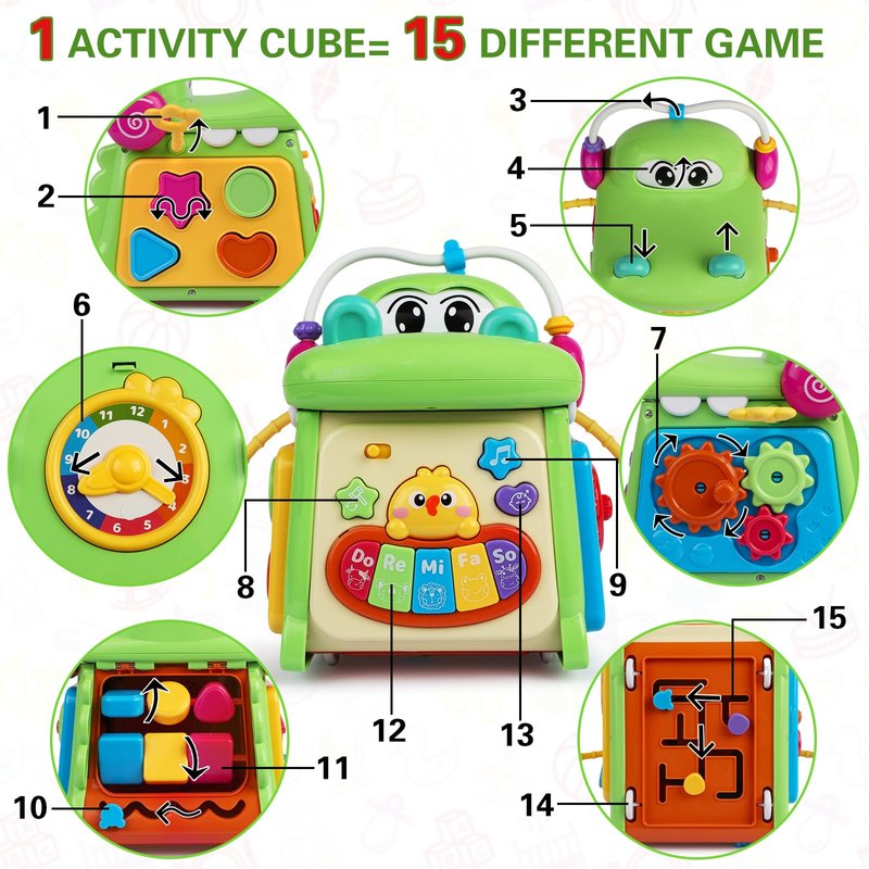 - [15 IN 1 BUSY CUBE]Our busy cube is endless fun for babies and toddlers. It keeps them engaged and stimulated for hours. It has 14 activities that promote fine motor skills, hand-eye coordination, and cognitive development in infants.