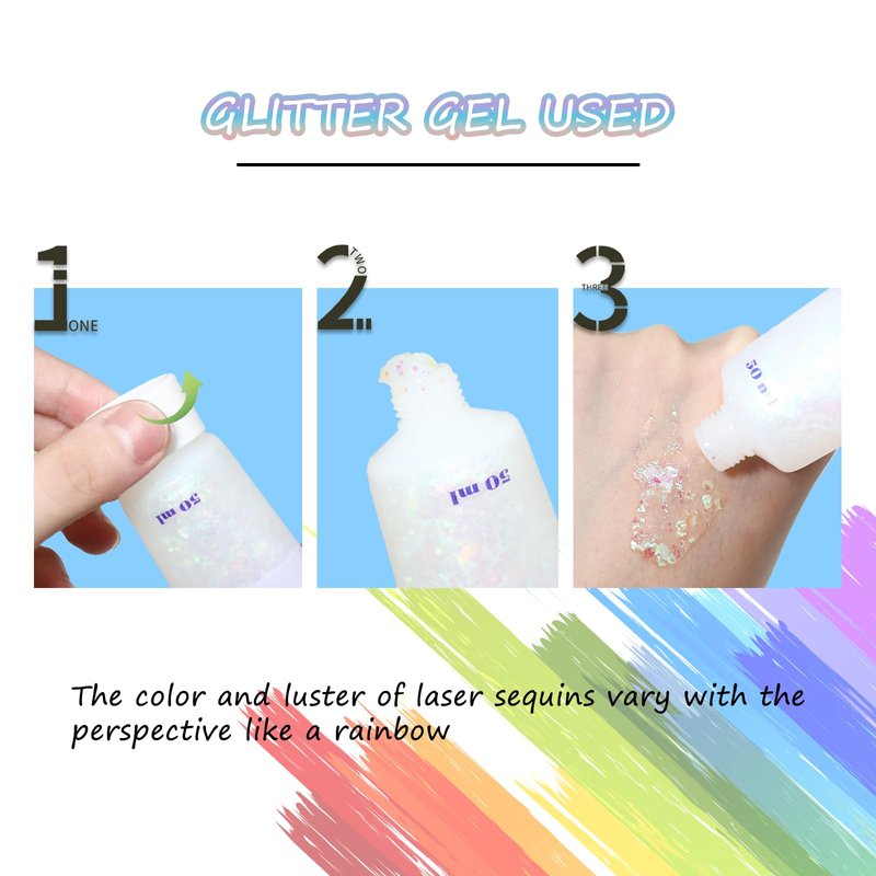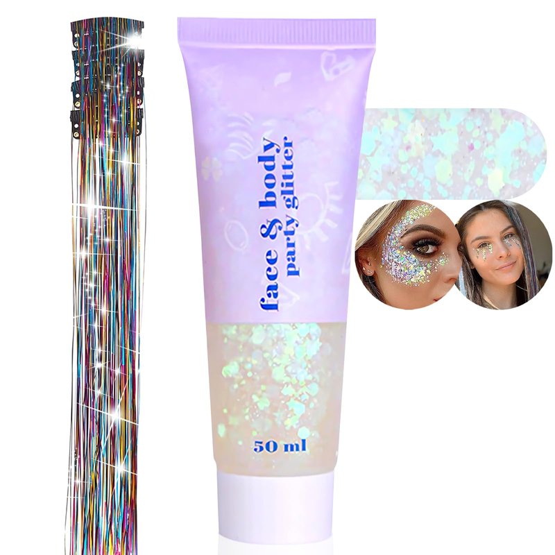 - White Body Glitter Gel and 4Pcs Colorful Hair Accessories Kit: Our holographic glitter gel contains 50ml of glitter gel, this face glitter gel is made from large pieces of glitter in different shapes and sizes, and the color and gloss of laser glitter allows you to glow from different angles. The upgraded hair tinsel has a metal clip design. You can easily add glitter to your hair and instantly become a shiny girl.