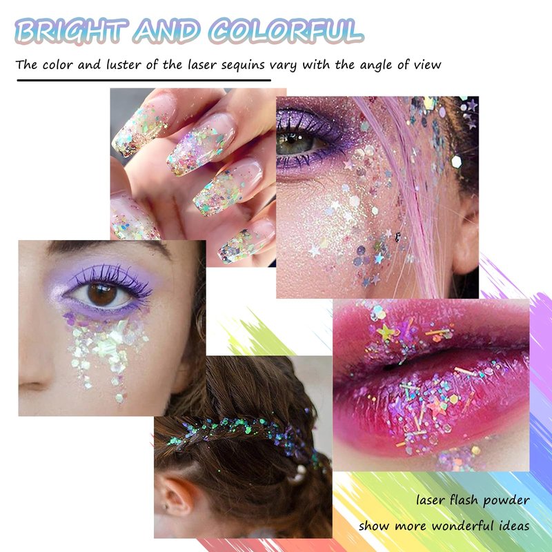 - Easy to Use: Chunky glitter is a shiny body gel that is sticky, so you don't need to use glue when applying it, and can be applied directly to any place on your body and the clothing you want to decorate. You can easily remove body glitter with water and soap. The colorful hair piece also only needs to open and close the tension clip to disassemble and install. Easy to operate, save your makeup time.