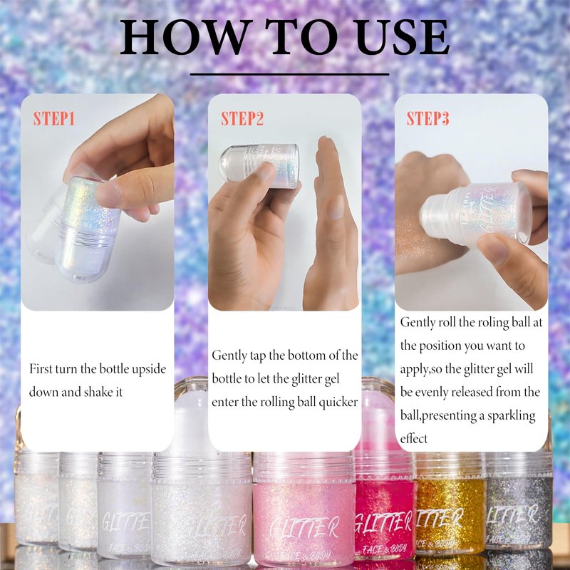 - 【Upgrade Roll-on Design】 Upgrade roll-on design, unlike regular glitter, our roll-on glitter doesn't require extra tools or fingers to apply gel. Simply turn the glitter bottle upside down, gently shake it a few times, tap the bottom of the bottle to allow the gel to adhere to the ball, and then apply it to your skin. When the ball rolls on your skin, you will feel a comfortable and great touch, and the shiny gel will be evenly applied to your skin, giving you a good hands-free experience.
