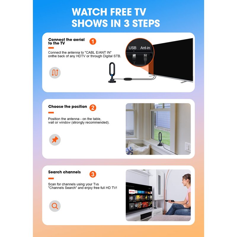 Our smart tv antenna adopts upgraded Smart IC Chip, Smart IC chip can receive signals 360° and filter out cellular and FM signals , receives TV broadcasts including 4K, UHD and 1080 HDTV for highest-quality picture and sound.Compared to other products that can only receive signals in one direction, this antenna is more convenient and effective in use.