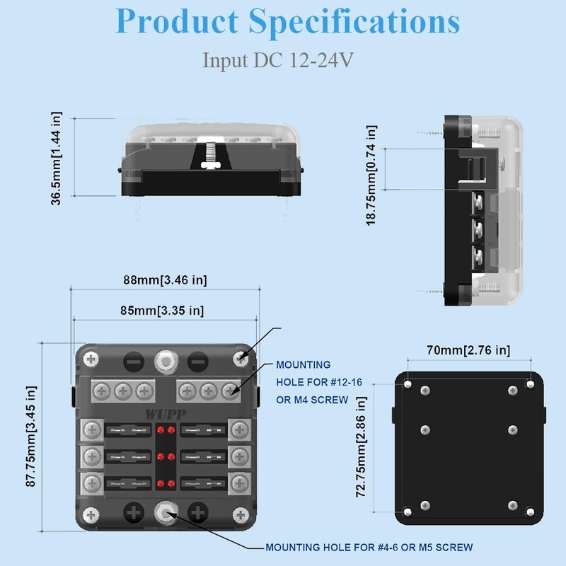 - UNIVERSAL PROTECTION: The input rated voltage of the fuse box is 32V,and the input rated current is 100A.Each circuit outputs a maximum current of 30A. All bus bars and fuse pieces are nickel-plated copper, corrosion-resistant and highly conductive.