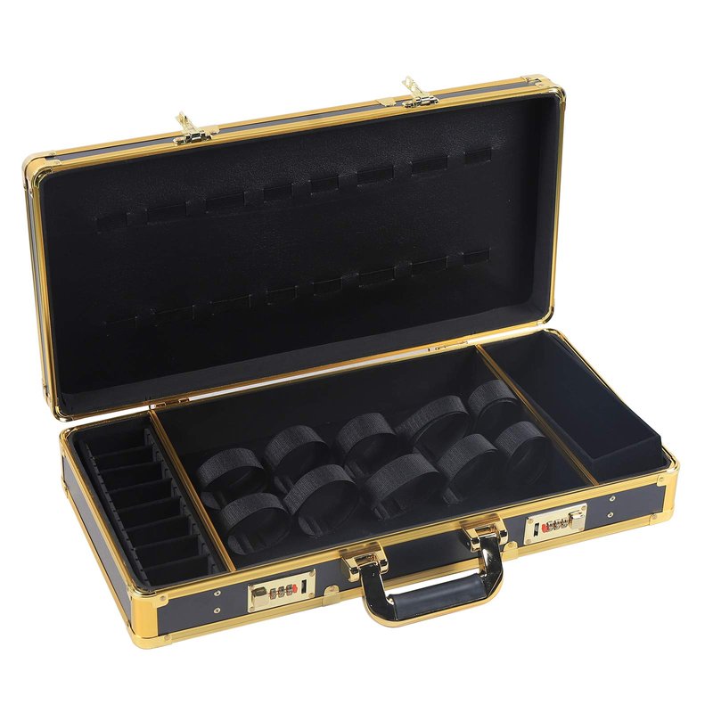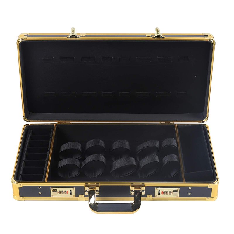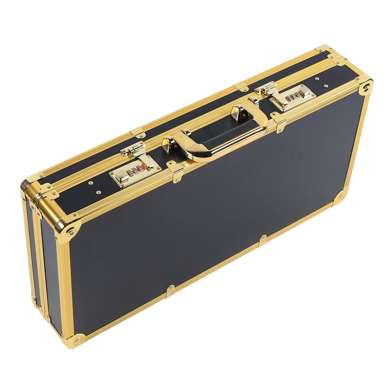 - Top grade aluminum finish and construction, reinforced steel corners for extra durability, beautiful smooth black finish, classic golden trim.