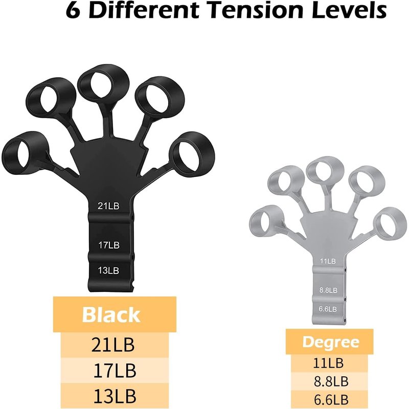 Adjustable Finger Strength Trainer 6 resistance levels of updated finger trainers enable the hands to get the maximum training.including 6.6LB, 8.8LB, 11LB, 13LB, 17LB, and 21LB. You can choose the appropriate level according to your grip strength.