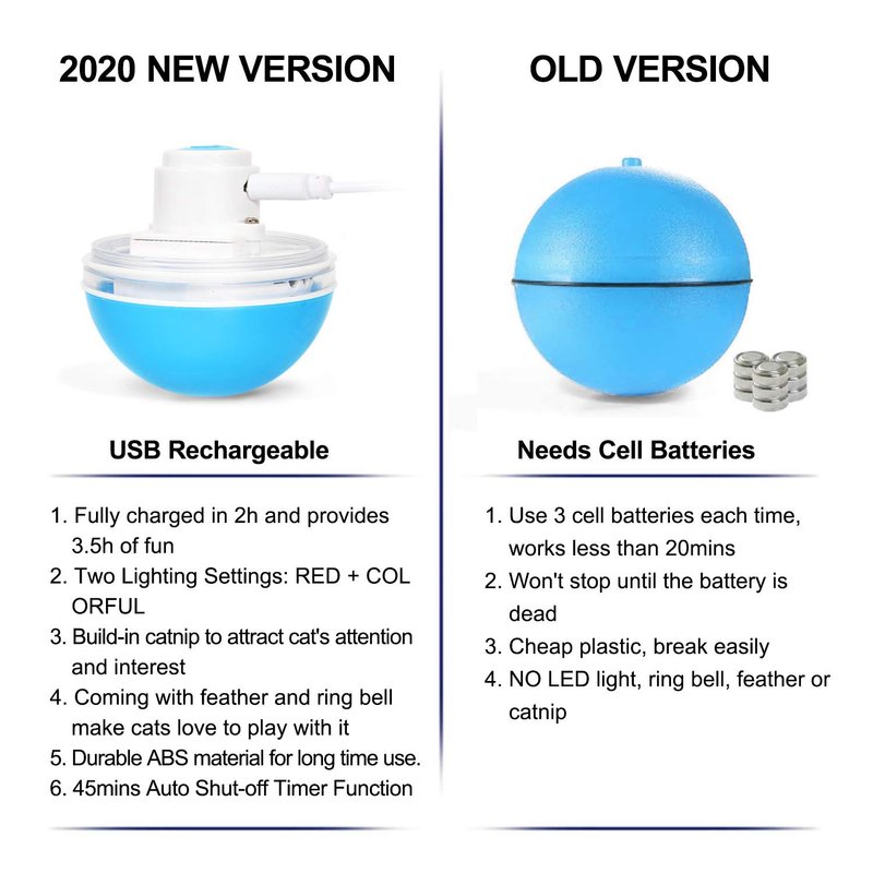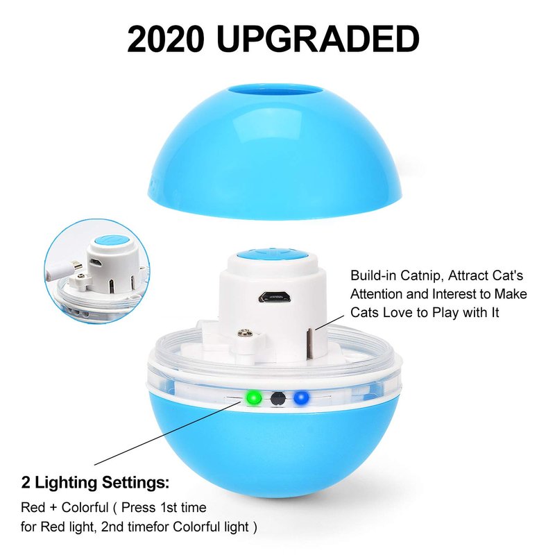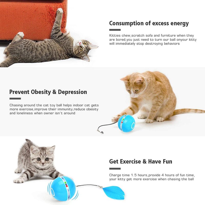 - 【Rechargeable & Timer & Durable & Safe】 - Fully charged in 2h and provides 3.5h of fun; 45mins Auto Shut-off Timer Function to prevent your kitty from losing interest in the cat toy ball, and perfect for those who don’t have time with their cats and dogs. Made of high-impact, wear-resistant, and non-toxic ABS plastic, won't break even hit the wall, durable and safe for your pets. Passed CE, ROHS, FCC certification.
