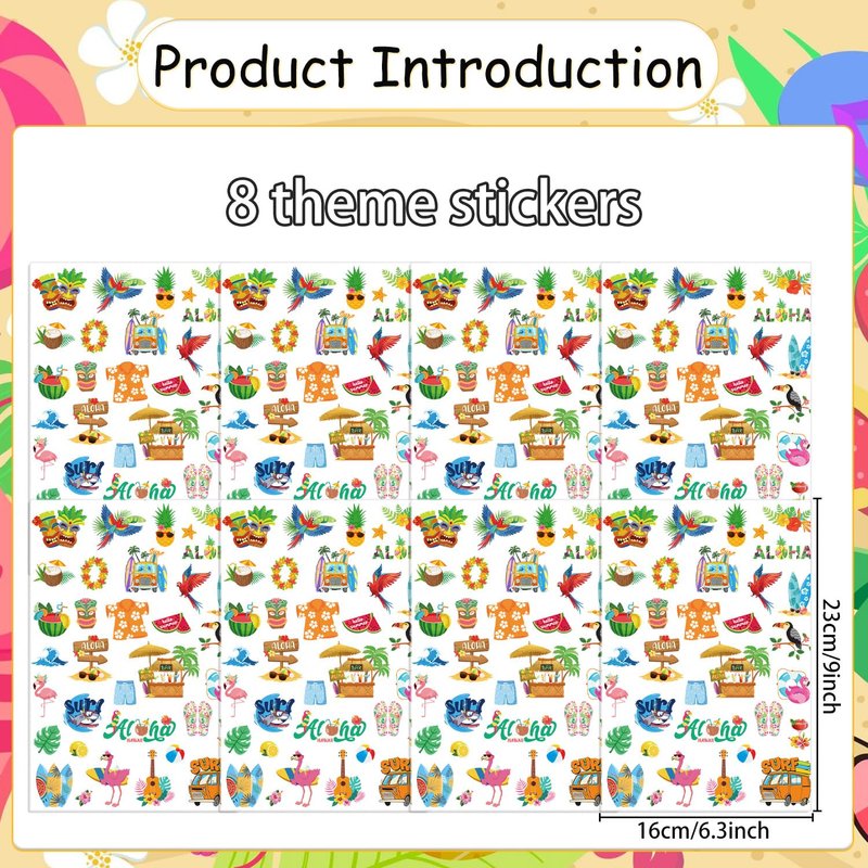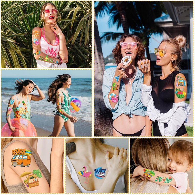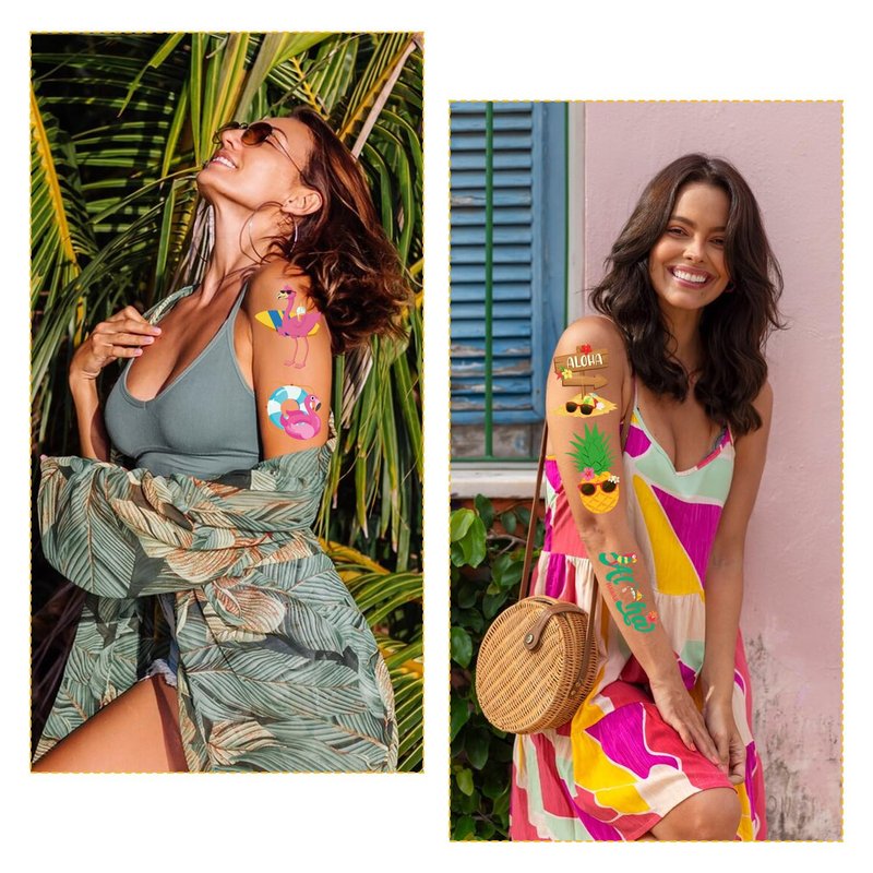 - Summer Temporary Tattoo: You will receive 8 Hawaiian-themed tattoo stickers, full of beach elements, including more than 20 patterns such as "Aloha", pineapple, leaves, board shorts, surfboards, etc. These patterns are exquisite and realistic, full of summer beach atmosphere .