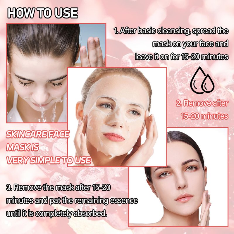 - 🎄【How to Use】Skincare face mask is very easy to use,just after basic cleansing,spread the mask on the face,leave it on for 15-20 minutes,remove it and pat the remaining serum until it is completely absorbed.